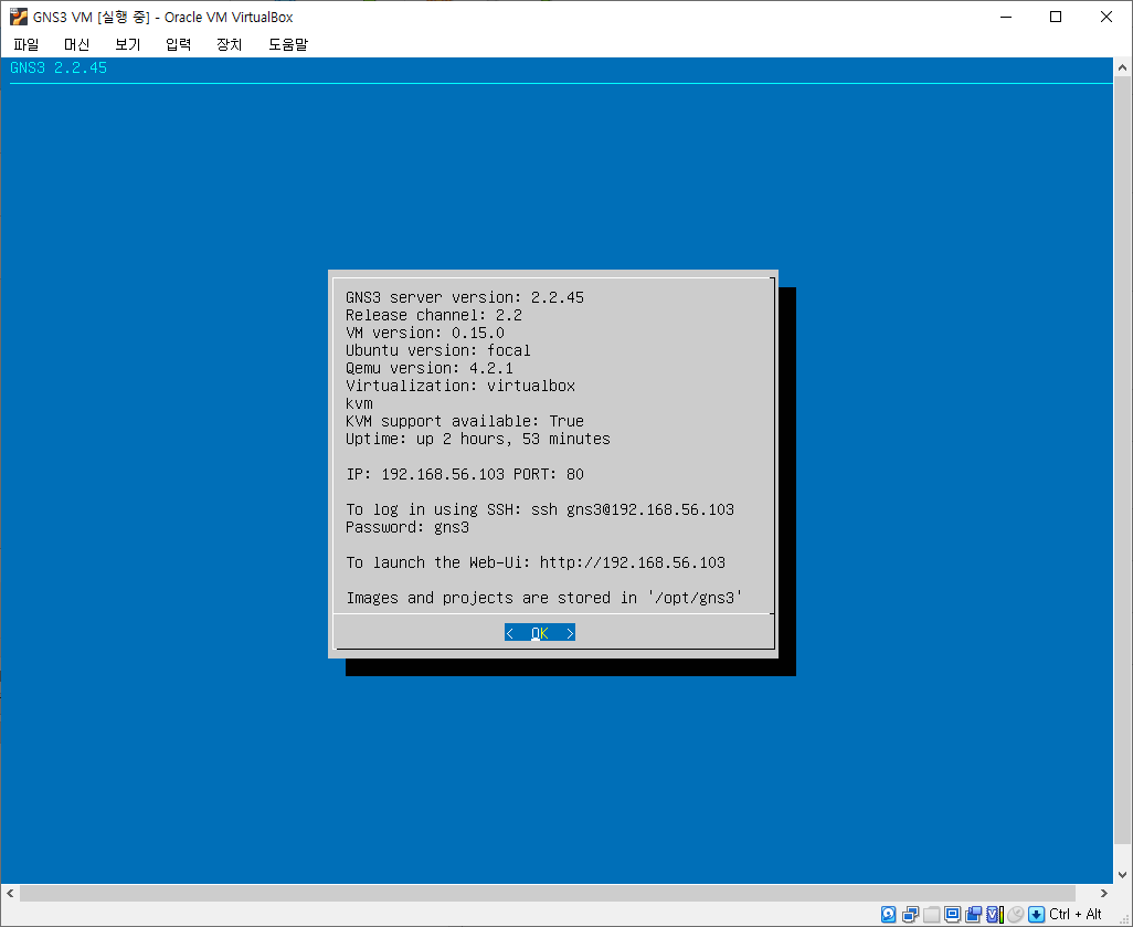 1. VirtualBox 설치 후 GNS3에서 받은 VirtualBox용 VM을 import 시킴